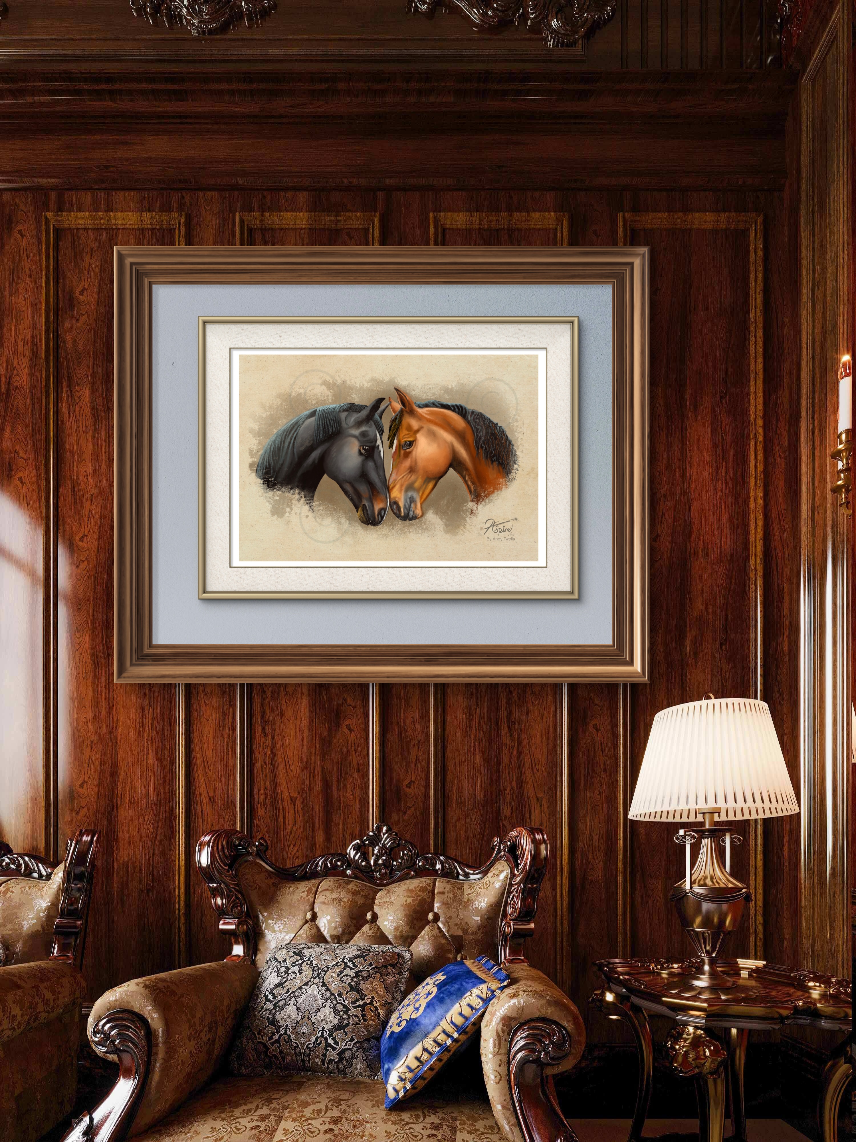 Horse buddies digital painting framed - classic art done digitally, once framed the image sits beautifully in your home. Whether canvas mounted or behind glass the Giclee print gives high definition colour to ensure your painting is a centerpiece for any room.