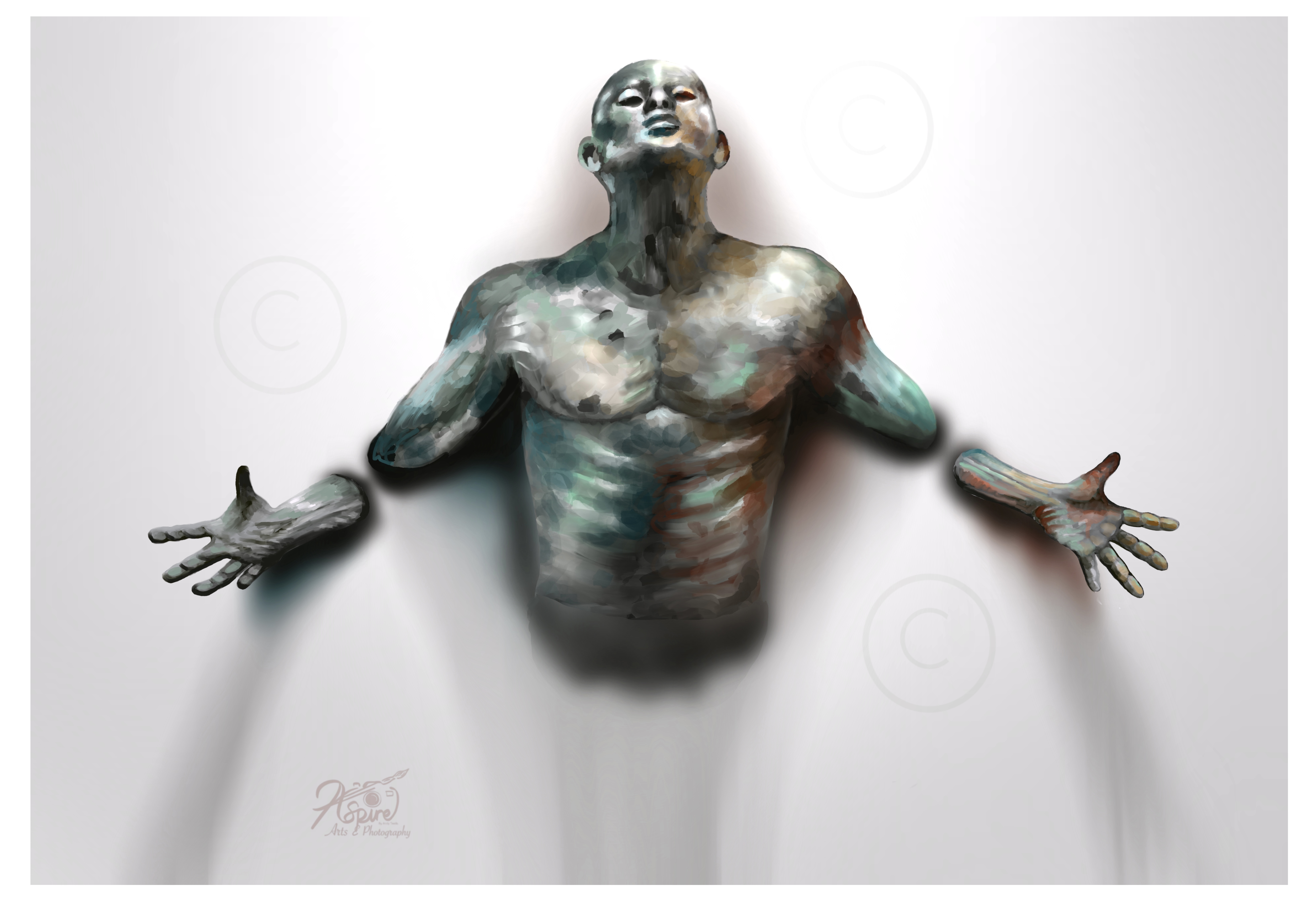 Captured in bronze - 3D effects are dependant on shadows that separate the background from the subject. A beaten copper effect adds to the concept of restraining the subject in the background, as if it wants to escape its predicament or stay frozen and beaten.