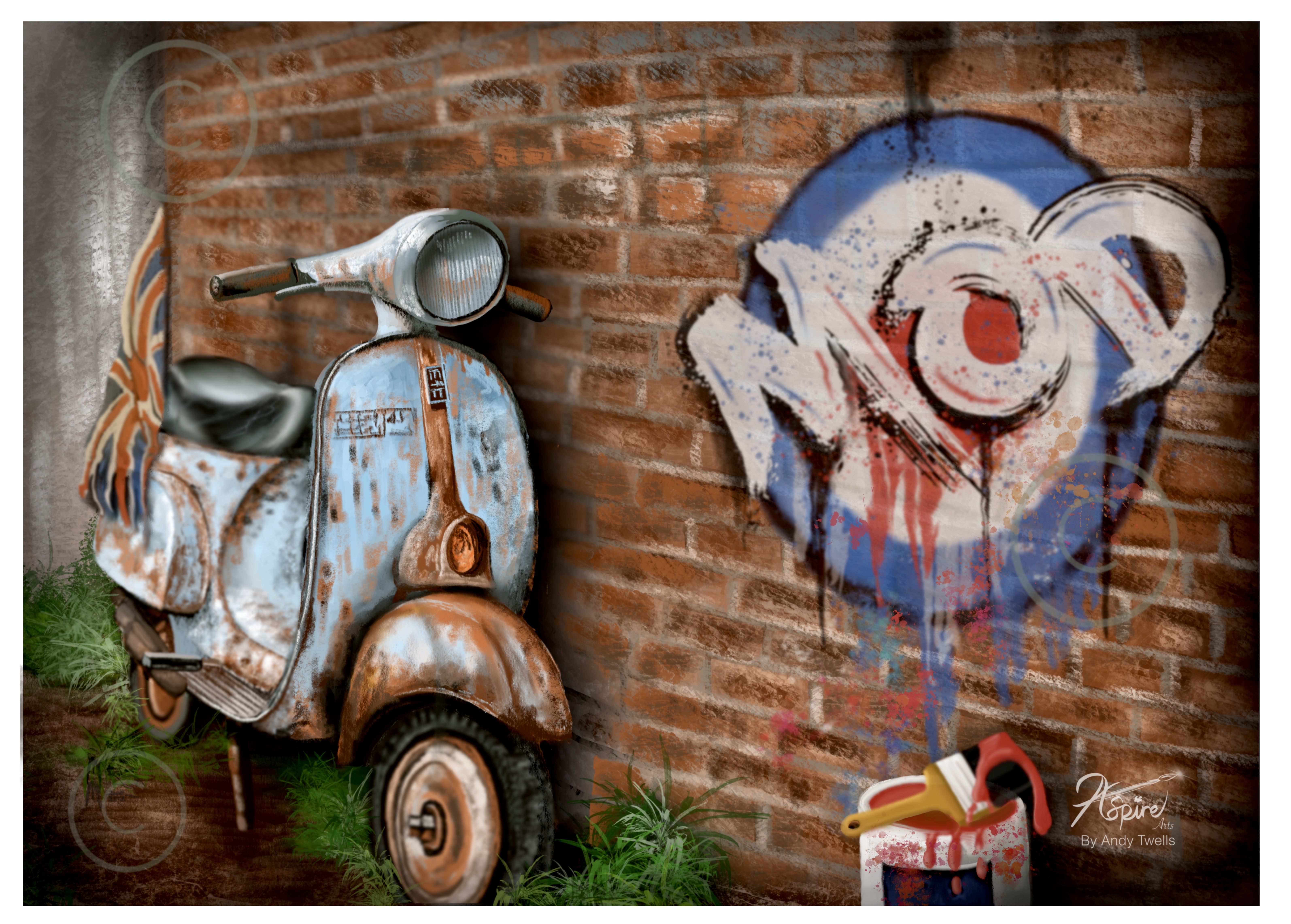 ‘ Young at Heart ‘ but getting older! Represented by A rusting scooter going to root down a back alley, reflecting a youth movement that captured an age of Britishness and left its mark